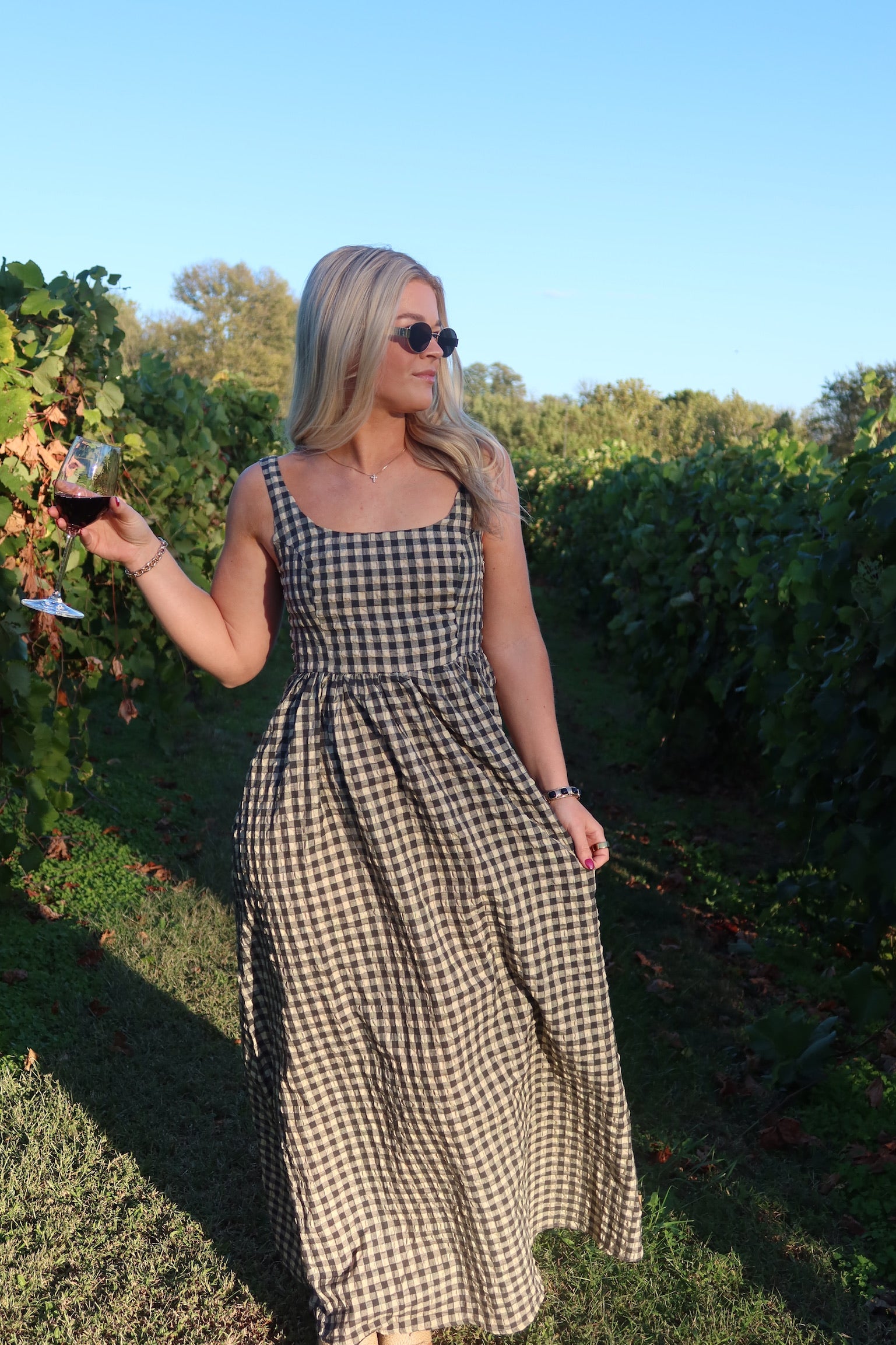 A checkered maxi dress featuring a square neckline, fixed straps, and a shirred back for a flattering fit, this dress combines structure with effortless flow. The subtle neon threads throughout add a modern twist, while the side invisible zipper ensures a smooth finish. Perfect for brunch dates, garden parties, or golden-hour moments.