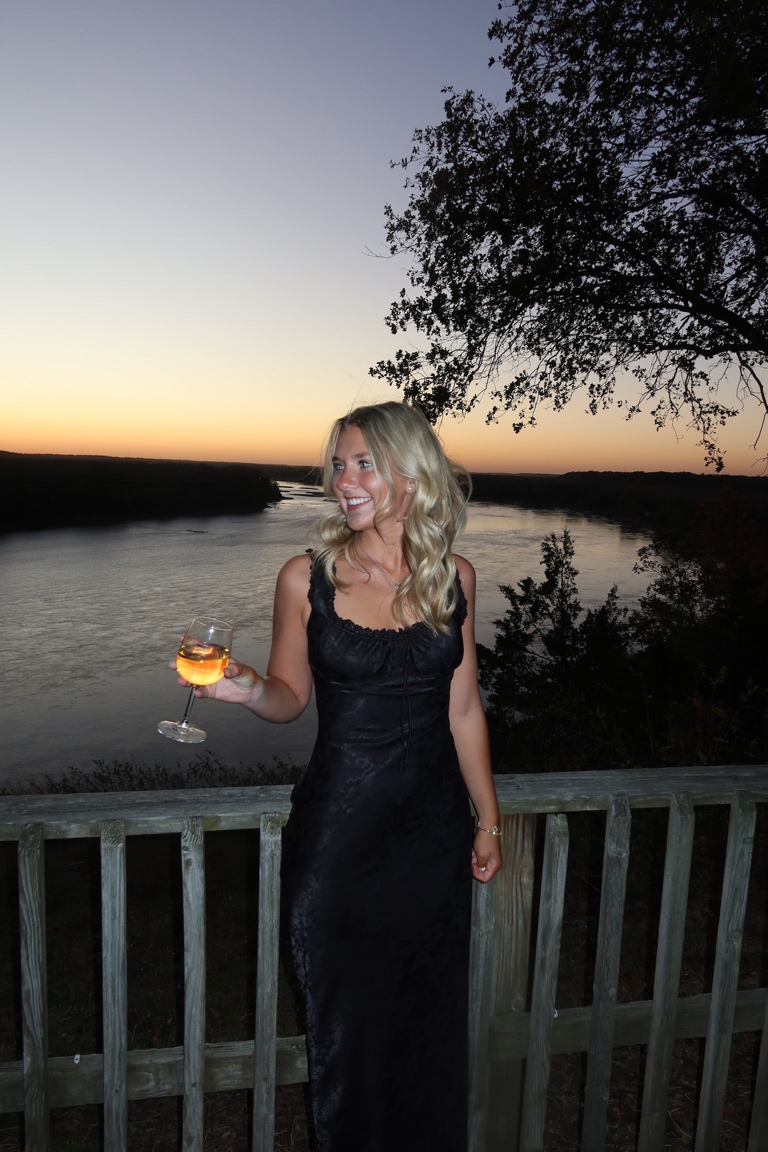 The Midnight Merlot Dress, crafted in a rich satin fabric with an elegant abstract print. Featuring a ruched bust, lace trim detailing, and an open back with a delicate tie, this midi dress brings a touch of romance to any occasion. The sleek silhouette and smooth finish make it perfect for date nights, dinners, or evenings out.