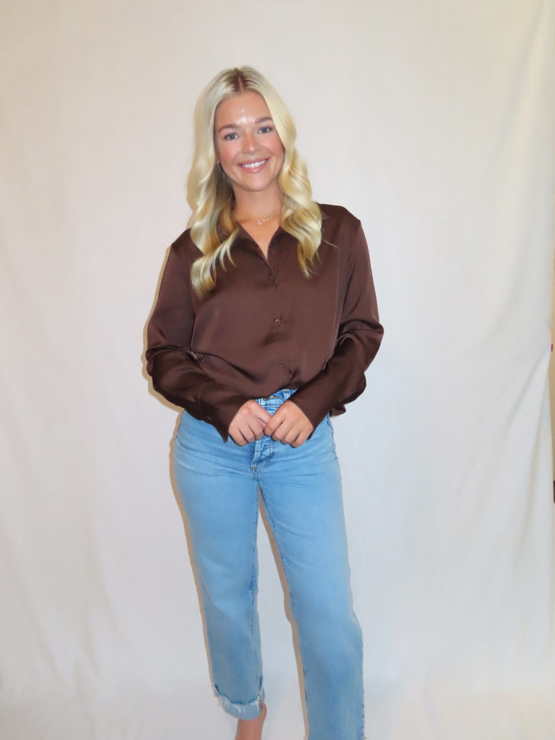This dark brown silky button down shirt features a lightweight drape, button cuffs, and a timeless tailored fit — the perfect elevated staple for day-to-night styling.