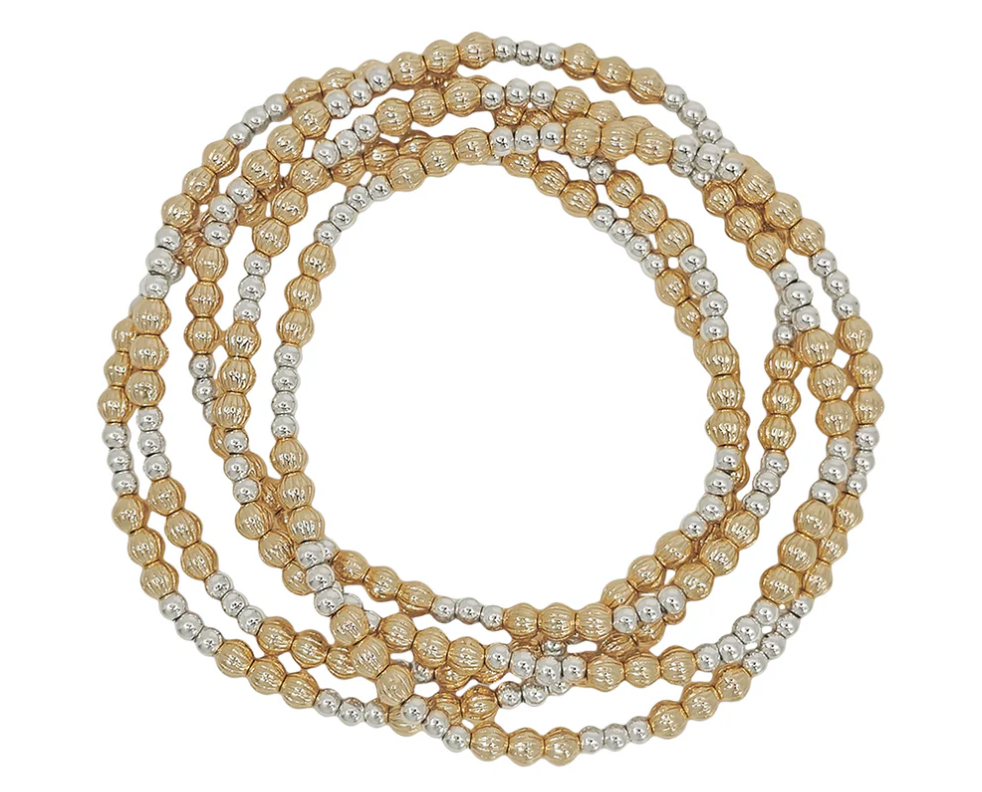Water Resistant Set of 5 Gold and Silver 4MM and 3MM Beaded Stretch Bracelets