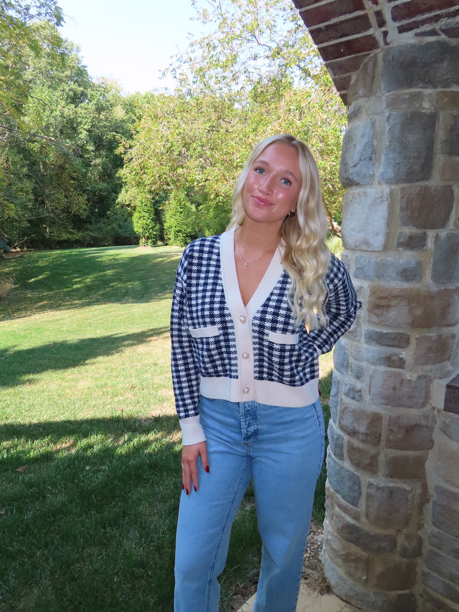 A navy and cream checkered knit that blends classic workwear appeal with modern comfort. Designed with pearl buttons and front pockets for functional style, this cardigan offers a cozy yet polished look perfect for the office, coffee meetings, or layering over your favorite outfits.