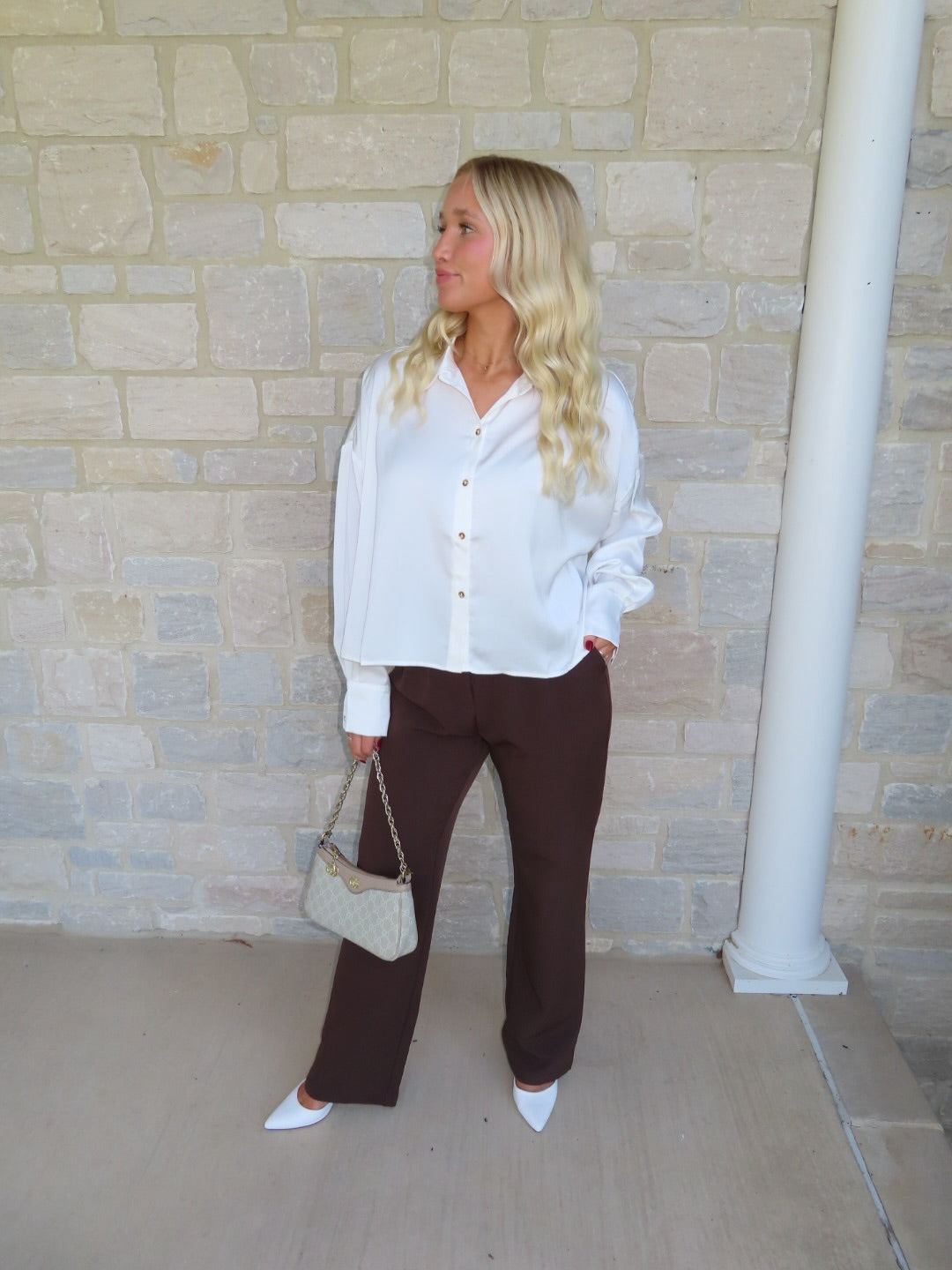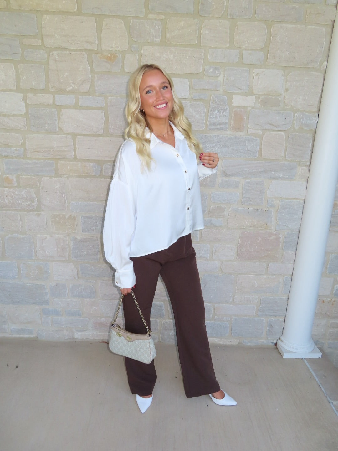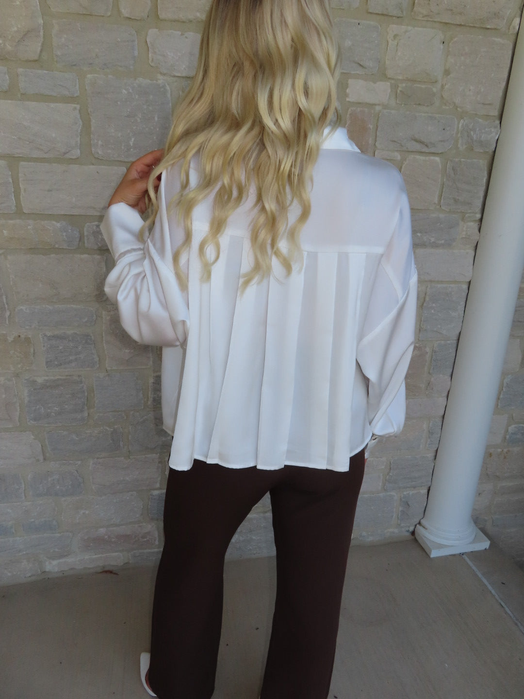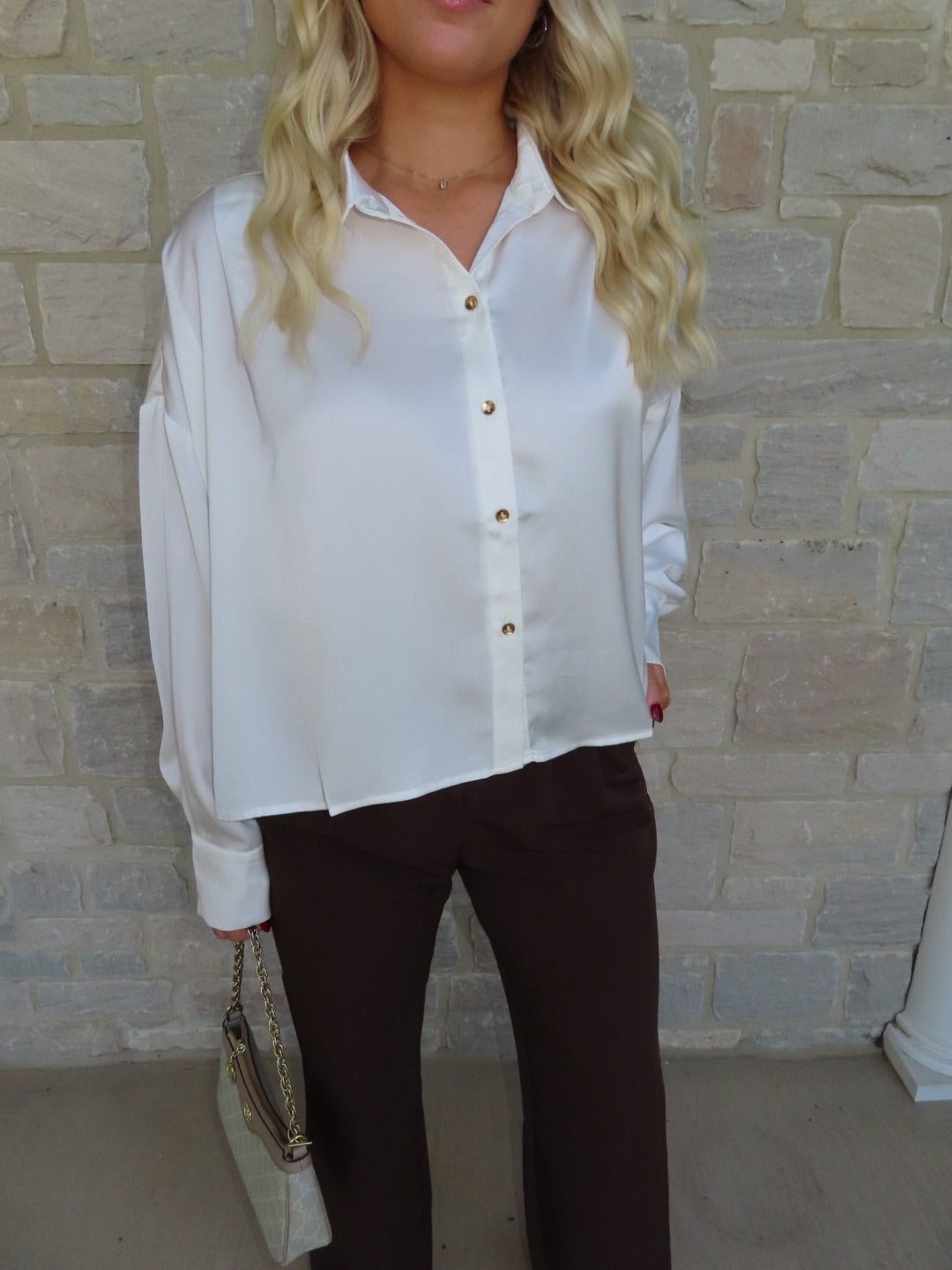 This white satin cropped button-up blouse features flowy sleeves and a chic, lightweight silhouette — perfect for dressing up or adding an elegant touch to casual outfits.